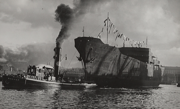 Svenska lastfartyget FYLGIA löper av stapeln den 30.10.1942 vid Eriksbergs Mek. Verkstad.