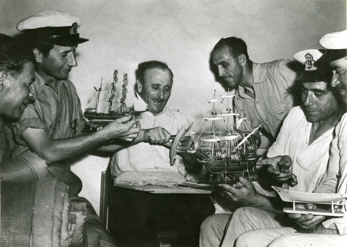 De italienska besättningsmännen på fartyg beslagtagna i USA fördriver tiden med modellbyggeri.
