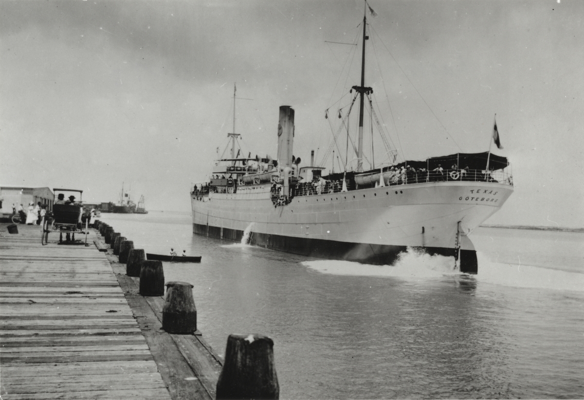 Lastångartyget TEXAS av Göteborg. Ankomsten till Galveston med 300 amerikanska flyktingar från Veracruz och Tampico år 1915.