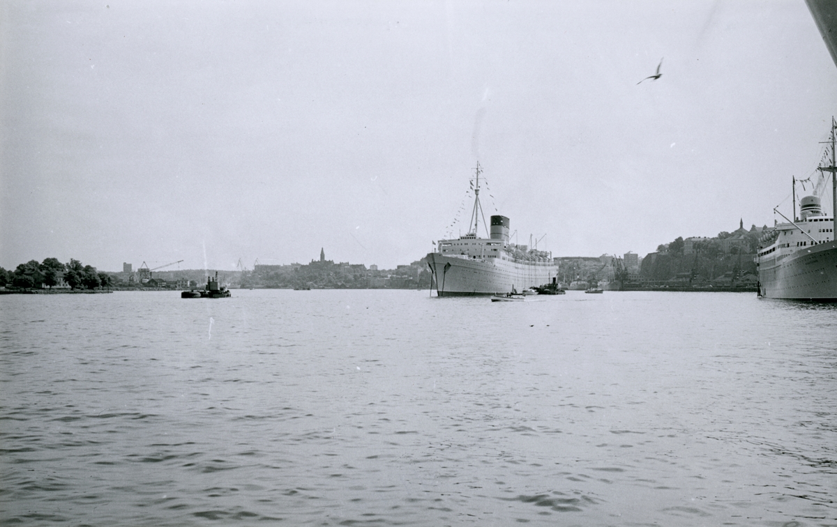 Foto från 1959 visande turist-& passagerarturbinångfartyg CARONIA av Liverpool för ankar på Stockholms ström.