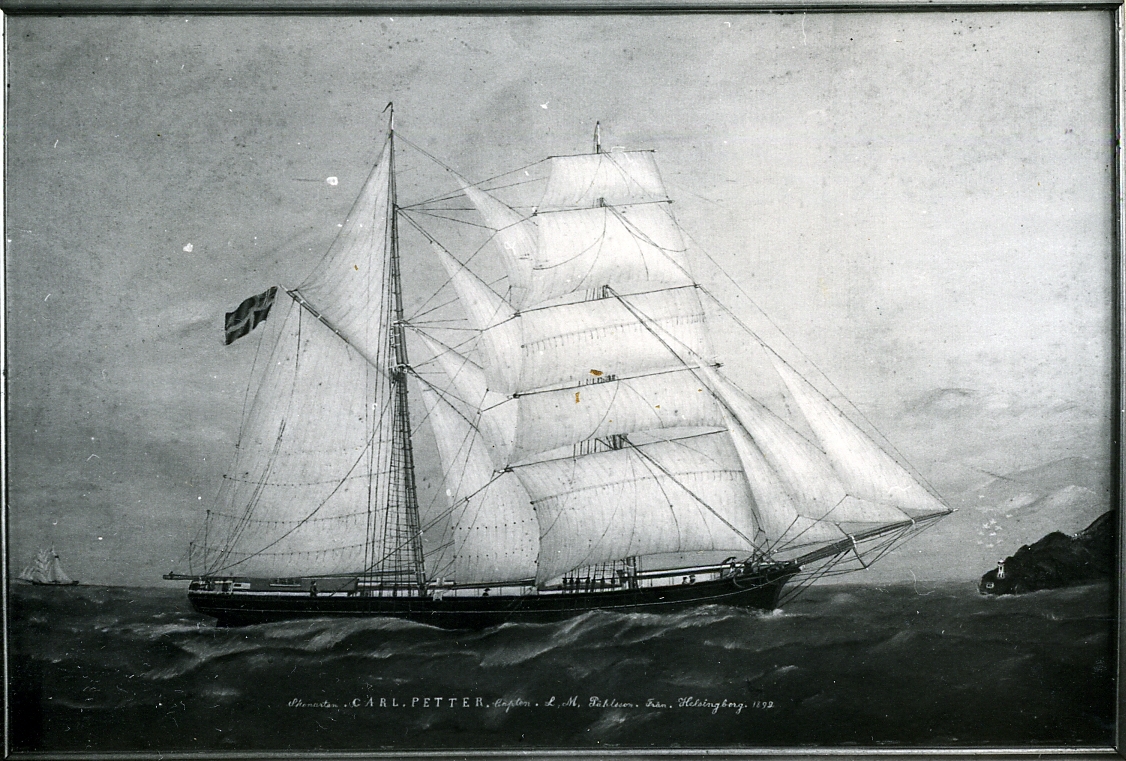 Fartygstavla hos fru Ruth Pålsson. Skonerten Carl Petter från Helsingborg. Capt. L. M. Påhlsson. Oljemålning på duk signerad A. Påhlsson. Skåne, Malmöhus län, Viken.