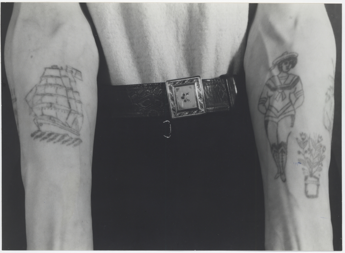 Vänster arm: Bild av flicka, utförd av tatueraren Carl Gustafsson ("Tatueringskalle"), Göteborg, till ett pris av 3.- kr.