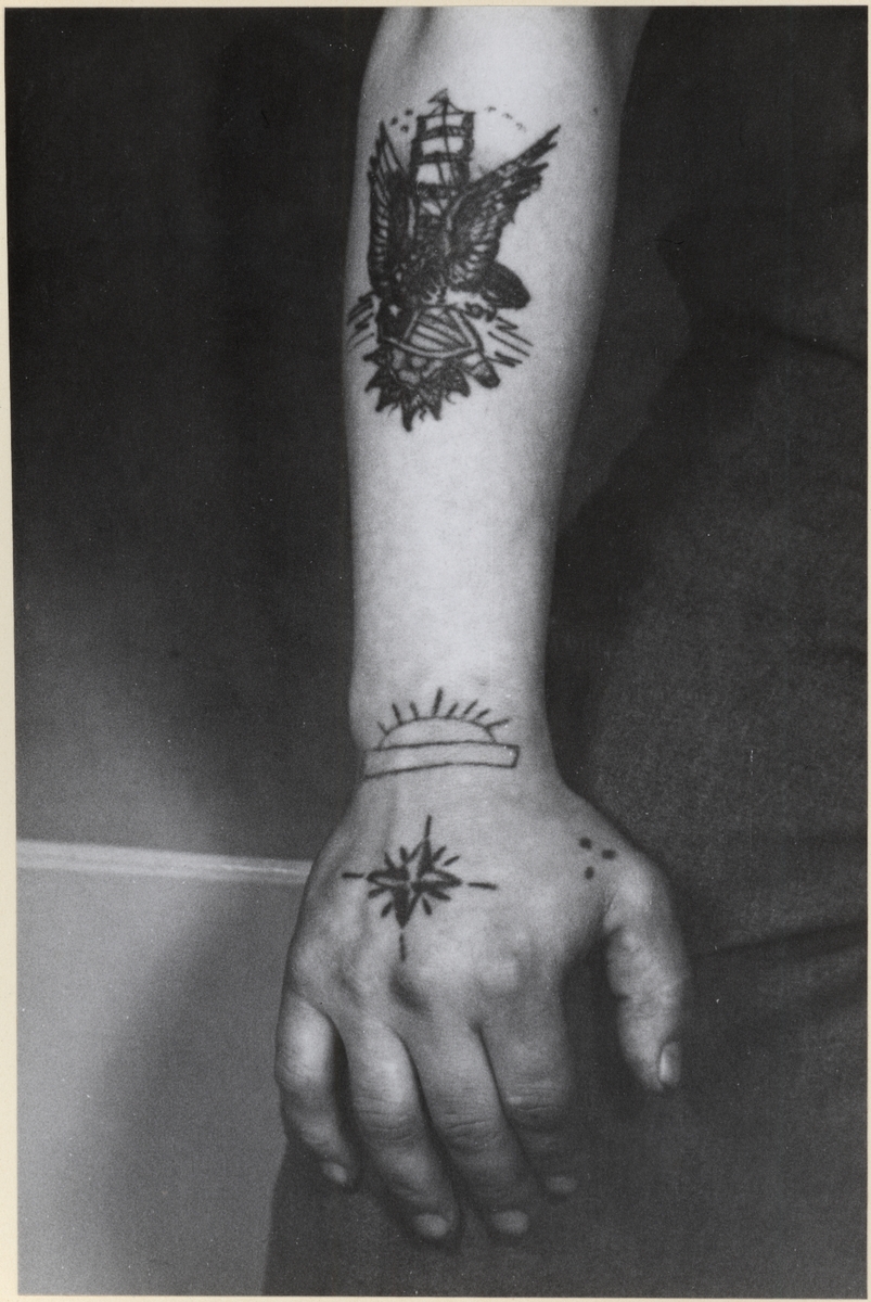 Tatuering på höger arm, utfört 1942 i Rotterdam av holländsk sjöman för 3 gulden. I färger blått och rött.