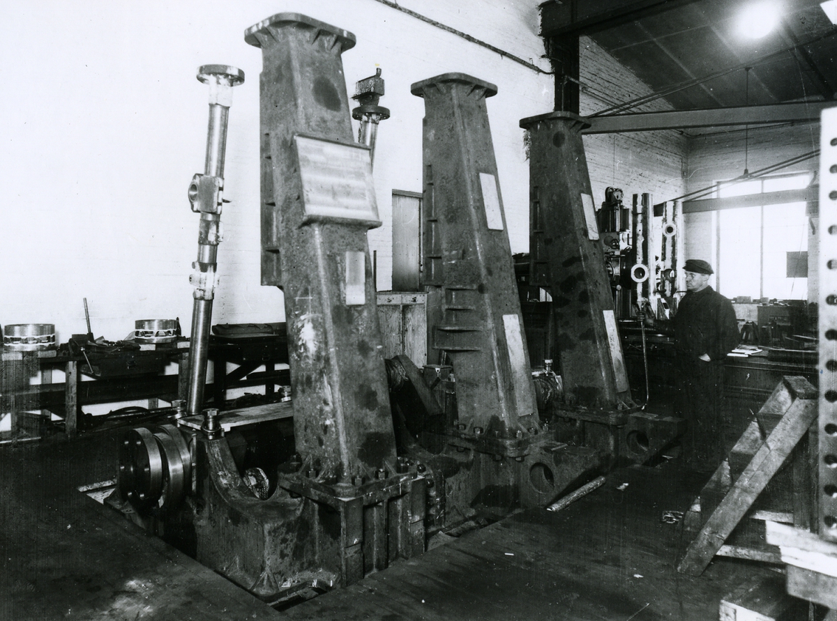 Oskarshamns varv. Provuppsättning av ångpannan i maskinverkstaden.[Bildtexten fel, provuppsättning av ångmaskinen]