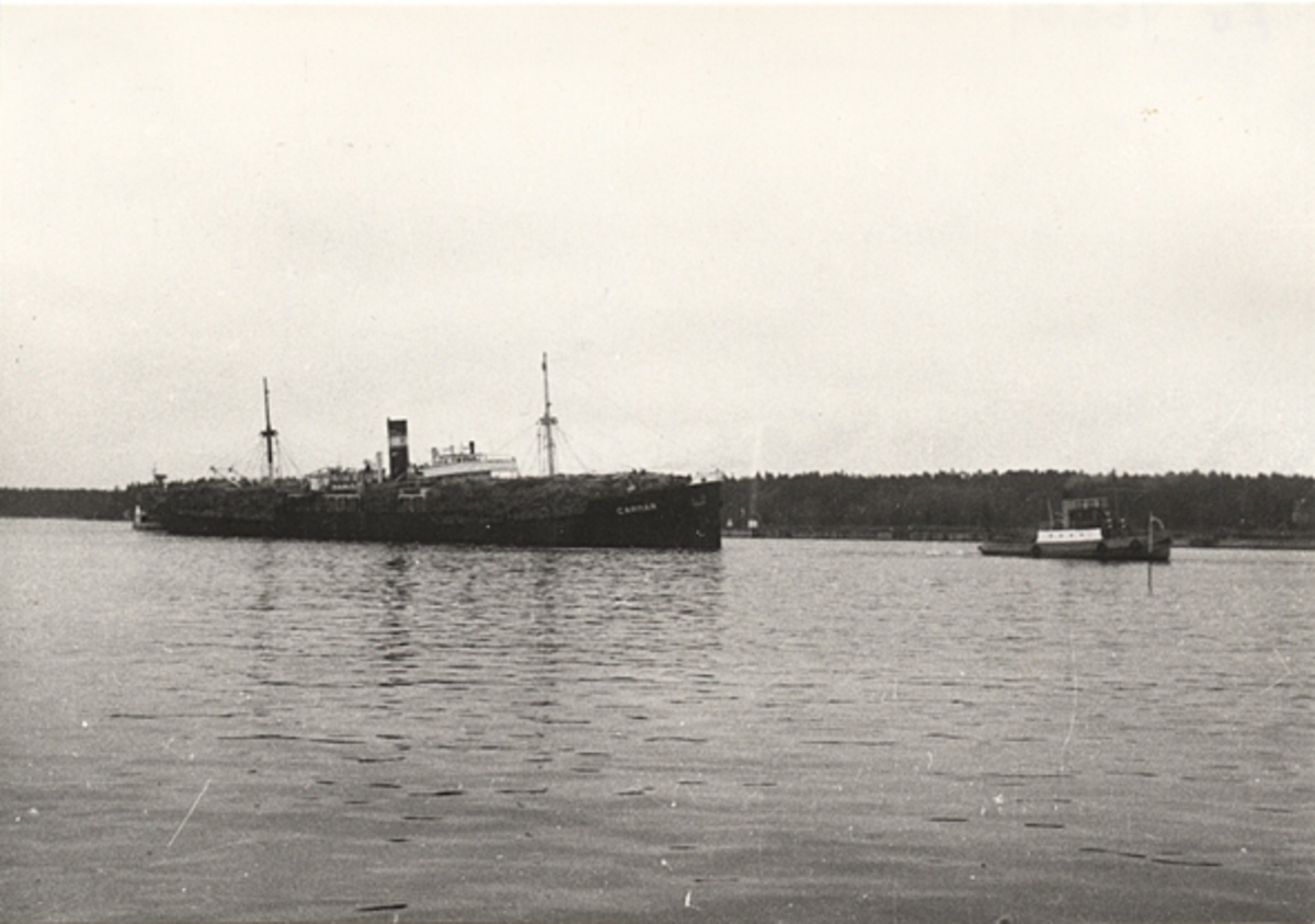 Titel: Ångfartyget CARMAR av Panama på utgång. Observera den stora däckslasten.