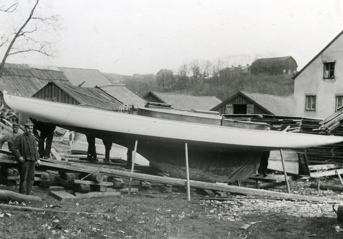Segelbåten ZAZA, byggd 1901 på Mälarvarvet efter Hugo Schuberts ritningar. Här första sjösättningen. Första ägaren E. Mattsson.