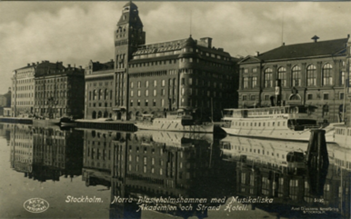 Stockholm. Norra Blasieholmshamnen med Musikaliska Akademin och Strand Hotell. Äkta Fotografi.