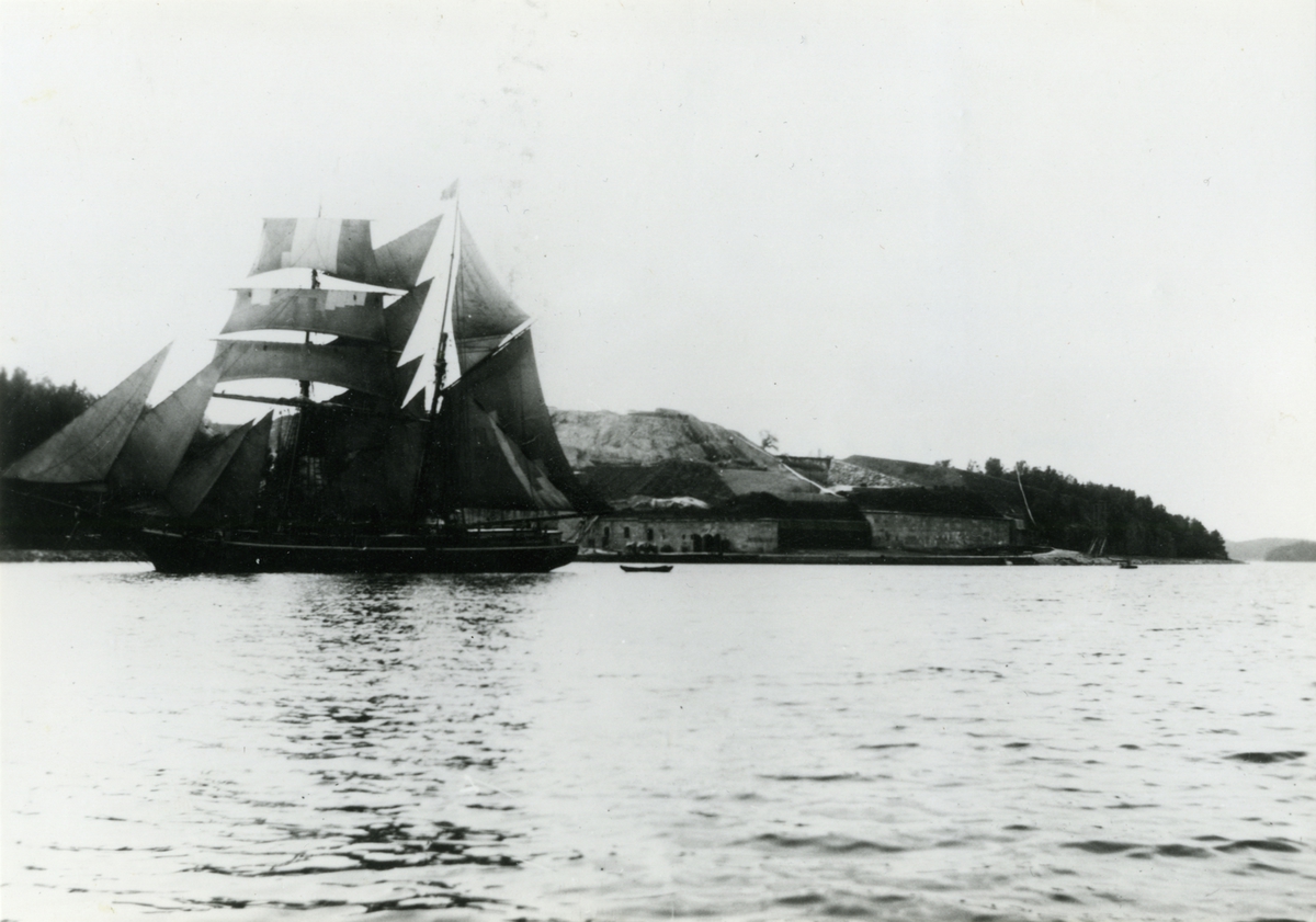 Skonerten passarer genom Oxdjupet på sydgående med alla segel satta.