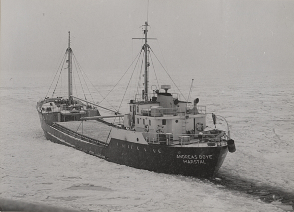 Lastmotorfartyget ANDREAS BOYE av Marstal (Danmark). Foto visar fartyget under gång genom isen i Öresund i början av 1963.