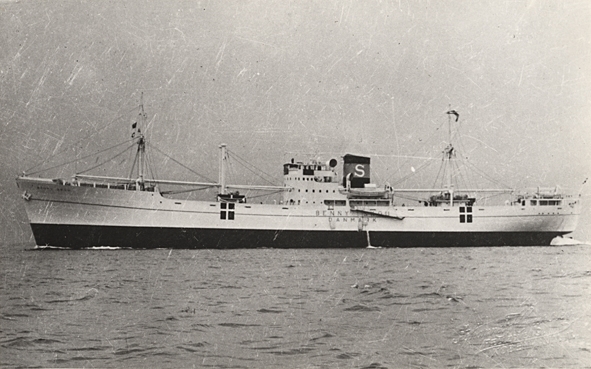 Foto i svartvitt visande lastmotorfartyget BENNY SKOU. Fotot troligen taget i Köpenhamn år 1945.