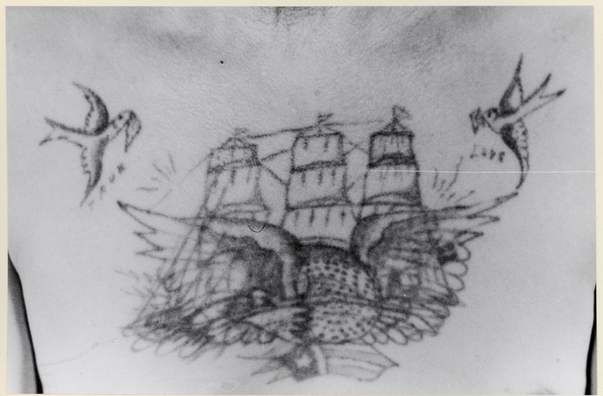 Tatuering på bröstet: Fullriggaren utförd i Stettin. Senare täckt av amrekansk örn, utförd i USA 1914 för 5$. De två svalorna äro utförda av en "dam" i Hamburg 1914 utan kostnad.
