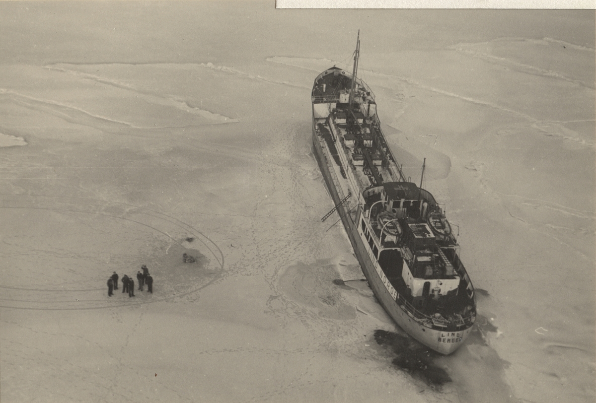 Norska fartyget LIND fastfruset i isen och fullständigt isolerat i över en veckas tid. Autogiron har landat vid fartyget med 100 kg proviant. Malmö, vintern 1939-40.