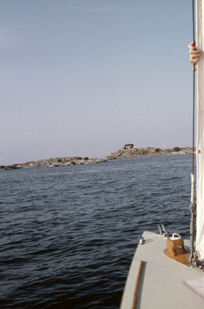 Vy över stuga på Simpnäs tillhörande Volrat Ulfwi. Bilden tagen från folkbåten KARP.