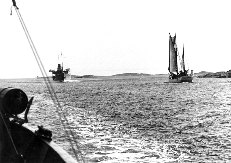 HM Hjvb 384:s resa. På gång i Göteborgs södra skärgård med Soya IV som eskorterat fartyg. Th Dansö. Fil Gunnar Jonssons undersökningsresa till västkusten juni 1940.