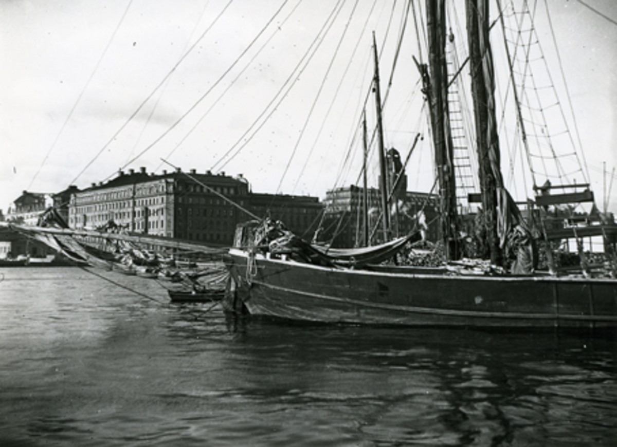 Titel: Vedjakten Sjörén av Länna lossar ved vid Strandvägskajen i Stockholm 6 okt 1936. Bakom ligger roslagsjakterna Sofia och Elvira.