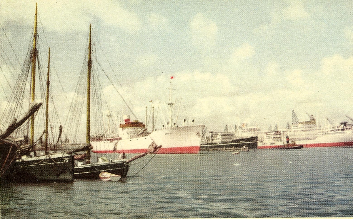 Vykort föreställande Göteborgs hamn. Vykortet är från 1940-talet.