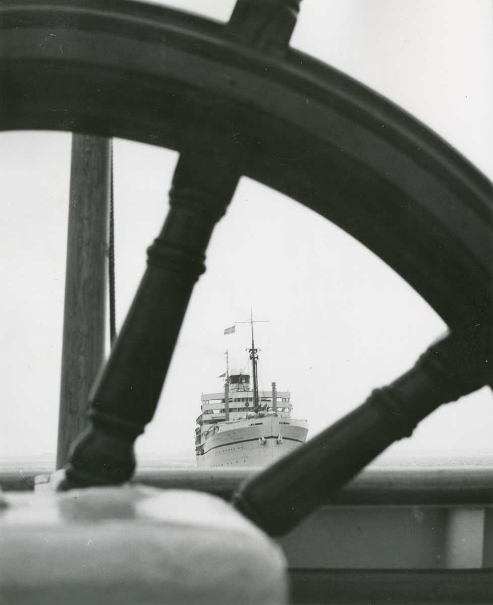 Unikt foto taget från den mötande bogserbåten på Malmö redd. Inkommander fartyg är DUNERA av London.