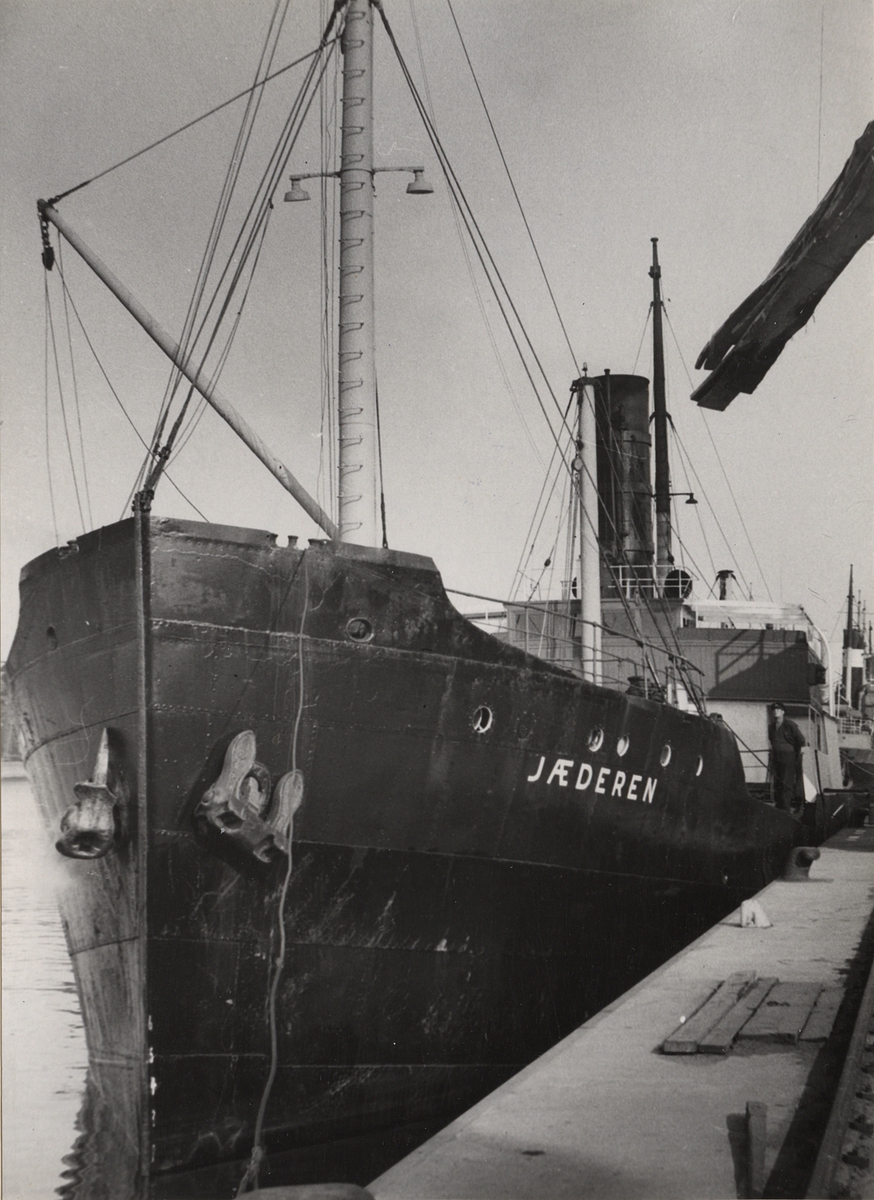 Lastångfartyget JAEDEREN av Stavanger lastande trä i Malmö i juli 1953.