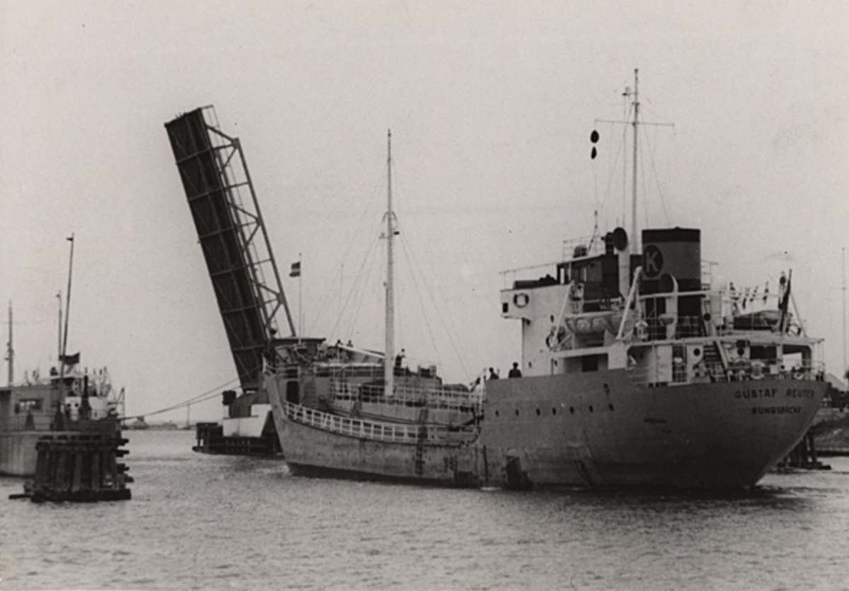Tankmotorfartyget GUSTAF REUTER under bogsering i Falterbokanalen efter motorhaveri. 1951.8.19.