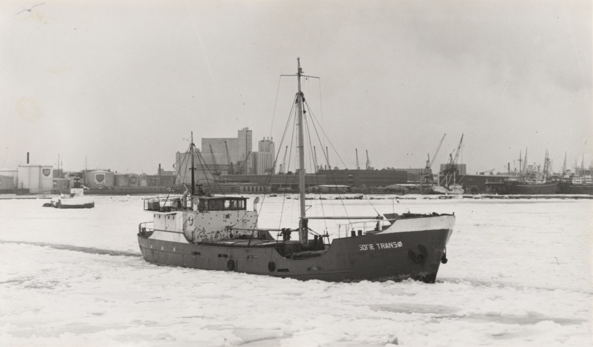 Det danska lastmotorfartyget SOFIE TRANSÖ av Köpenhamn i Öresundsisen i början av 1963.