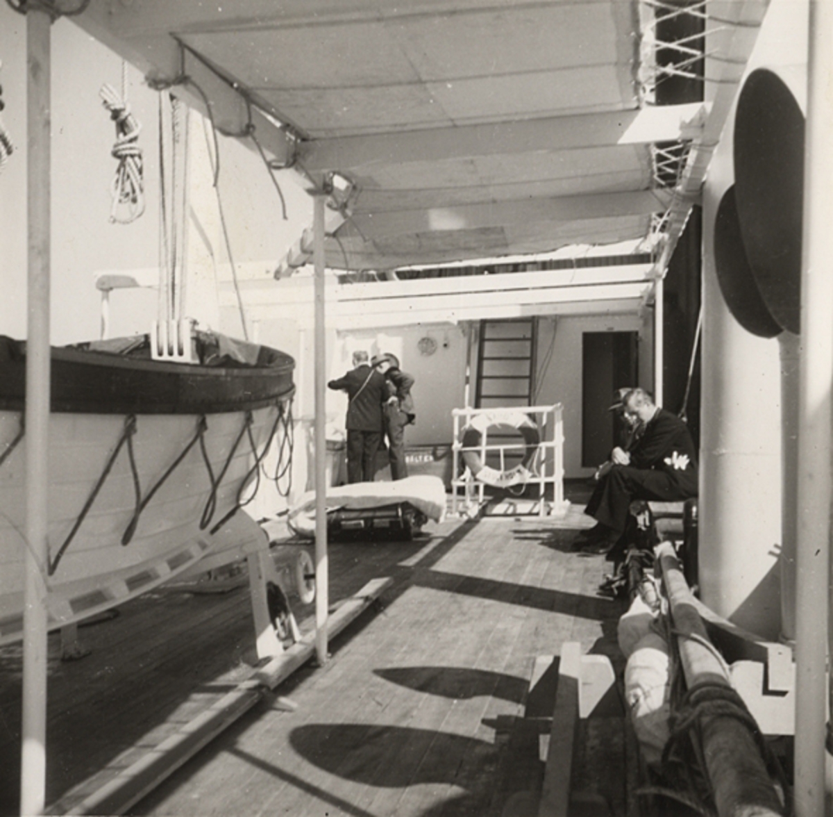 Lastångfartyget HARÖ under provturen 1949. Vy av båtdäcket.