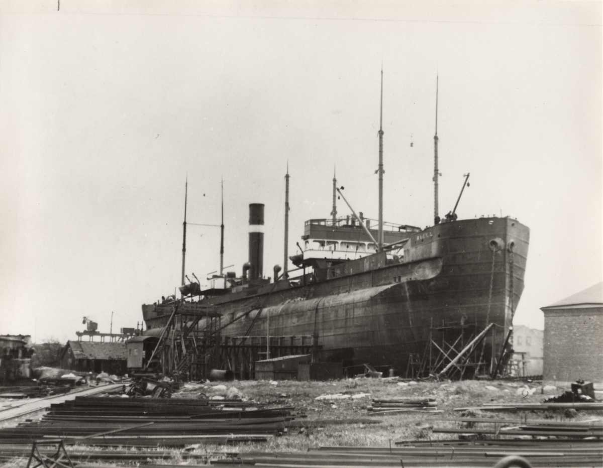 Turretdäckade lastångfartyget RIGEL torrsatt på Oskarshamns varv den 7.5.1938.