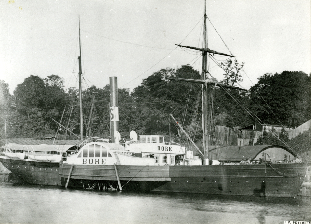 Hjulångfartyget BORE vid kaj. Glasad, ram i svart och guld.