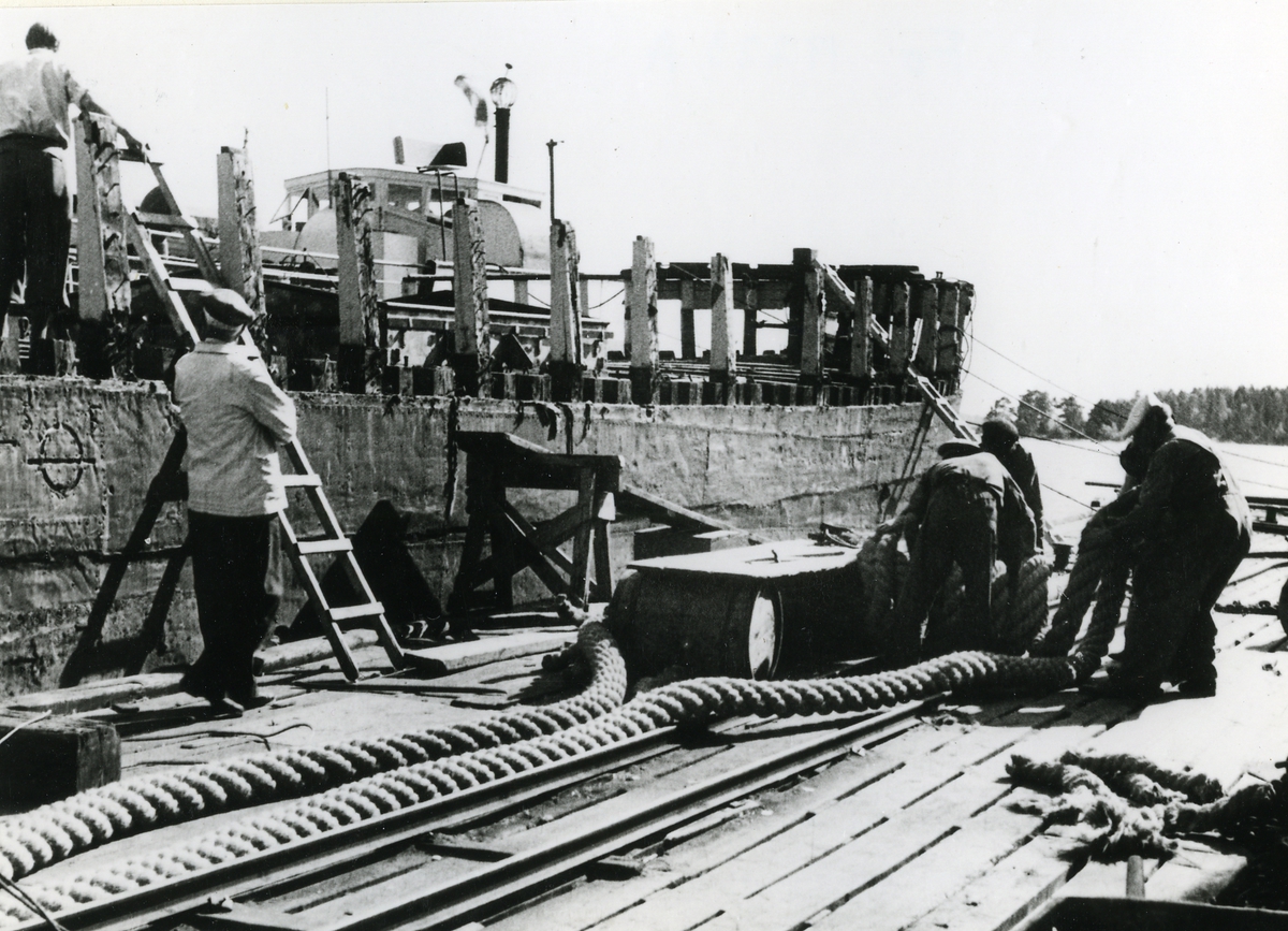 Ingenjör Hjerse, varvschef 1943-1951, vid pråmen som förbyggdes i pråmskjulet 1932-1934. Pråmens spant och timmer sticker upp och däcksstöttor går ner mellan garnering och bordlägning. (en däcksplanka borta). Utläggning av hoprullad tross.