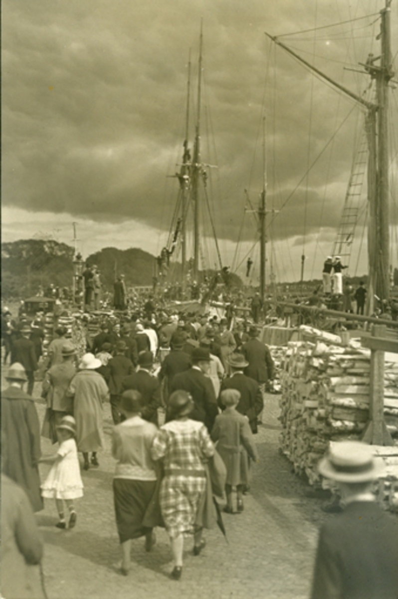 Strandvägen med Djurgårdsbron i bakgrunden. Folkvandring från D.N.:s strömsimning 1925. (Ivar Carlén återfinns från bilden)
