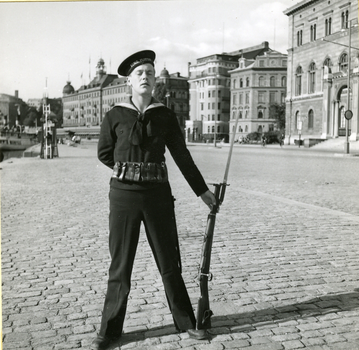 Vaktpost vid Skeppsholmsbron, Blasieholmen. T.h. Nationalmuseum och i bakgrunden Grand Hotel.