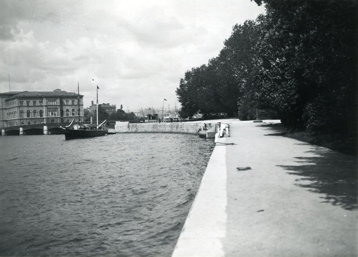 Utsikt från Skeppsholmskajen mot Nationalmuseum med broövergången.