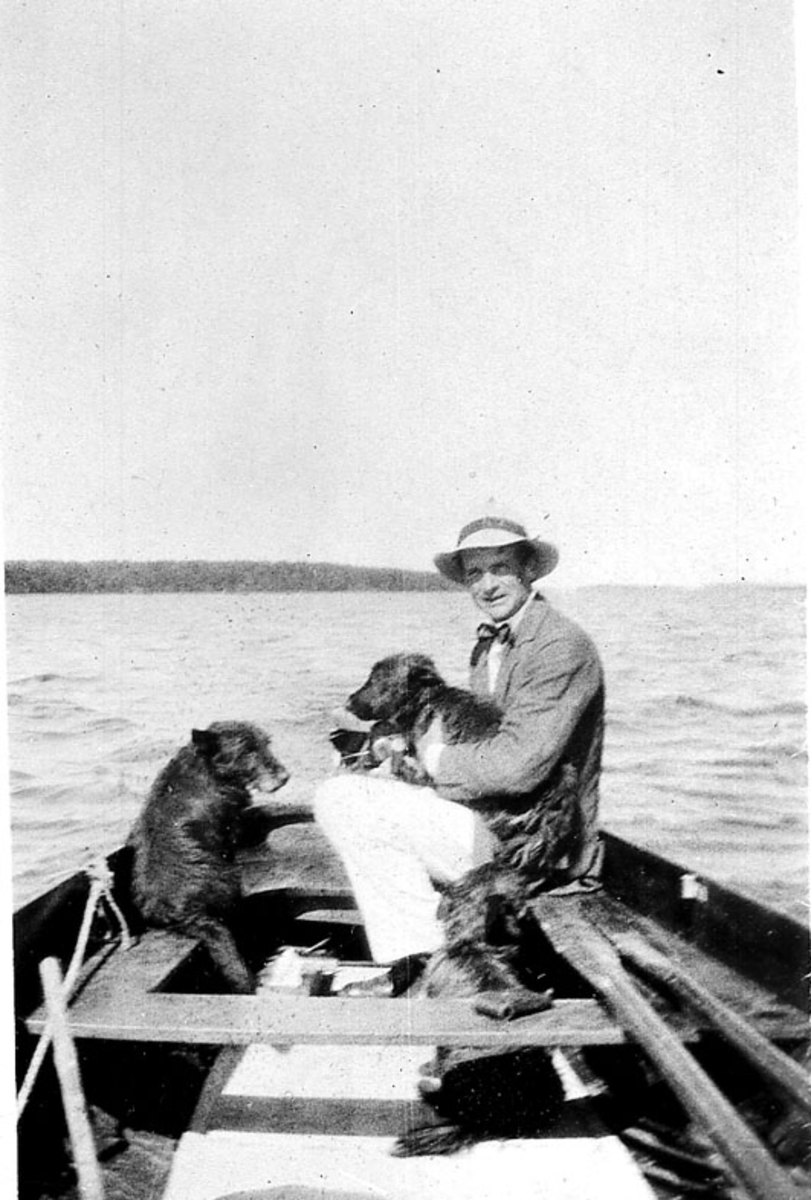 Eka med snurra. Man (John Hamilton) med tre hundar sitter i aktern och styr.