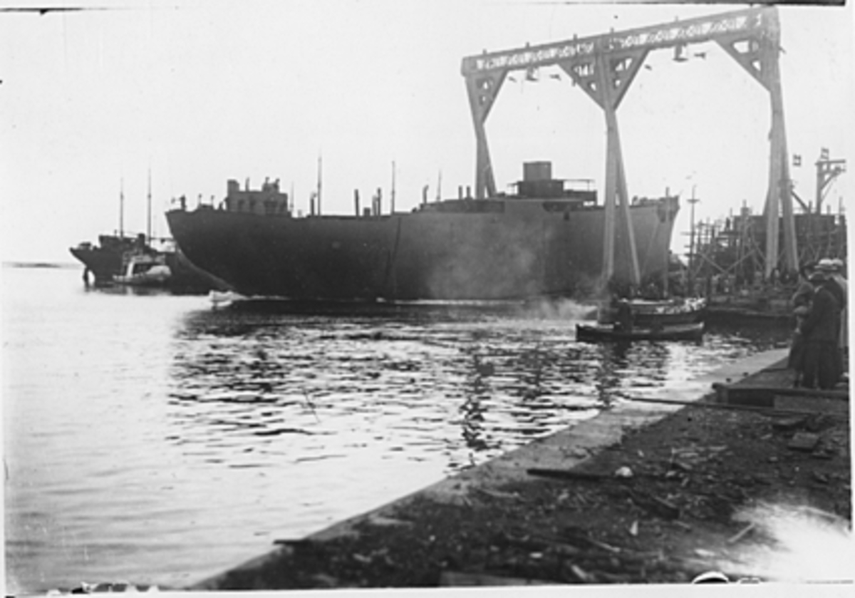 Sjösättningen av lastånfartyget AASNE vid Oskarshamns varv 1930.