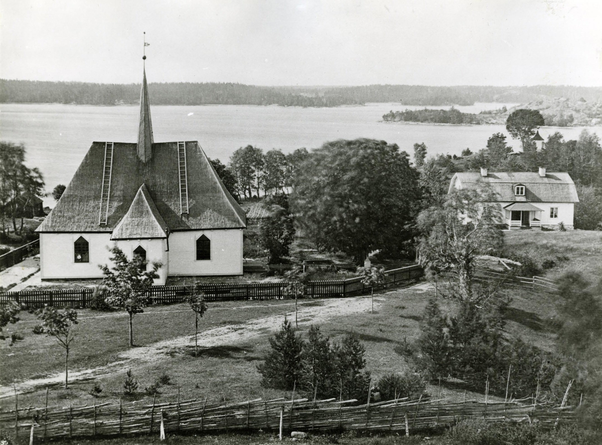 Djurö, Kyrkudden med kyrka och prästgård taget 1882.