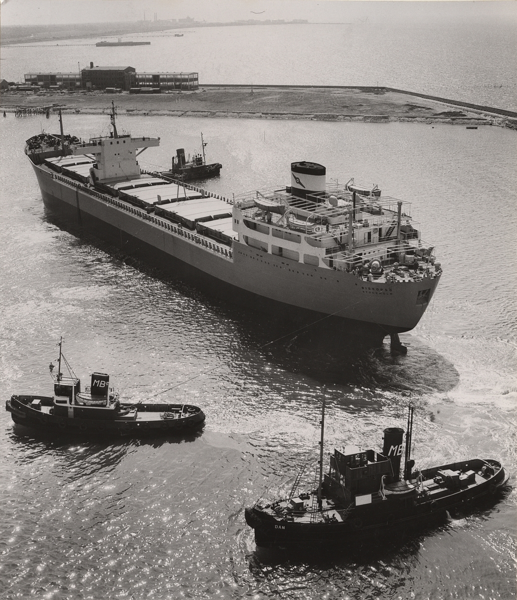 Lastmotorfartyget BISKOPSÖ av Stockholm på utgående från Malmö hamn under provturen 14/9/56.