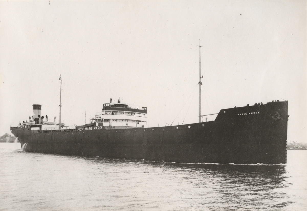 Foto i svartvitt visande tankmotorfartyget "MARIE MAERSK" i Köpenhamn.