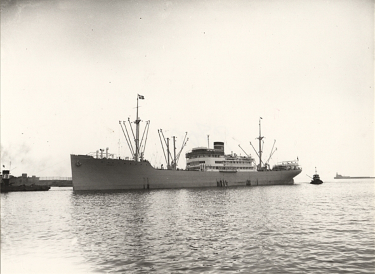 Foto i svartvitt visande lastmotorfartyget "BRASIL" i Köpenhamn under 1950-talet.