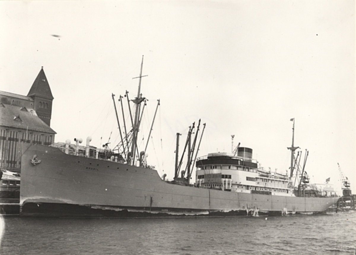 Foto i svartvitt visande lastmotorfartyget "BRASIL" i Köpenhamn under 1950-talet.
