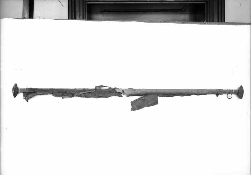 Fanstång med mycket små rester av en processionsfana. Stoffet rödmålat med meander och schablonerad rosett i guld. 1500-talets början.