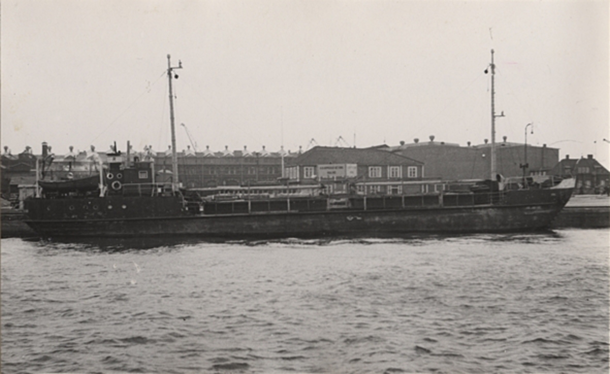 Lastmotorfartyget FRI av Köpenhamn liggande i Malmö hamn 1954. Fartyget är byggt av betong.