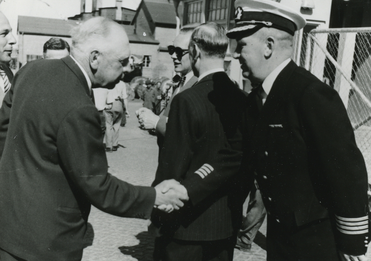 Oskarshamns varv. Fartygsdopet 1.7.1952 Direktör Robert ameln Hälsar på befälhavaren.