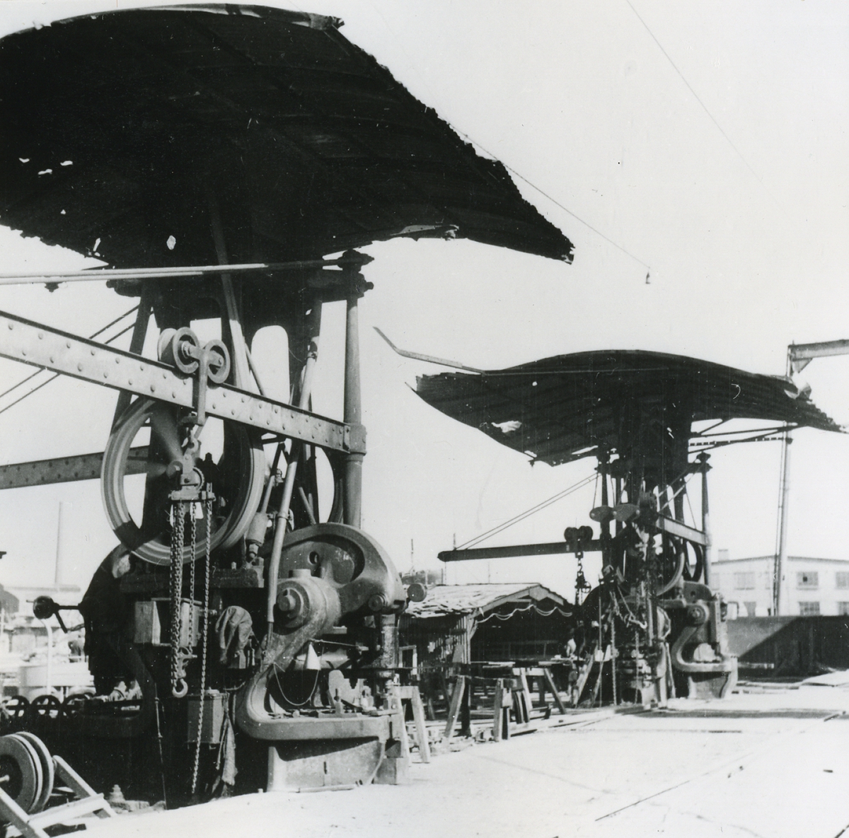 Oskarshamns varv. Skeppsbyggeripressarna. Främst "Långe Nisses" press med stans och presstod till vänster och stans till höger. Där bakom "Wernqvistens" press med stans till vänster och sax till höger.