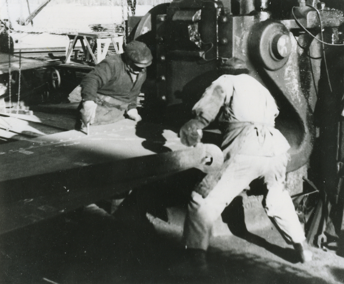 Oskarshamns varv. Plåtpressning. Basen wernqvist till höger. Till vänster Kalle Sellberg, som var "andre bas". Han hade till uppgift att rikta in plåten så att den klipptes rätt efter kritmarkeringen.