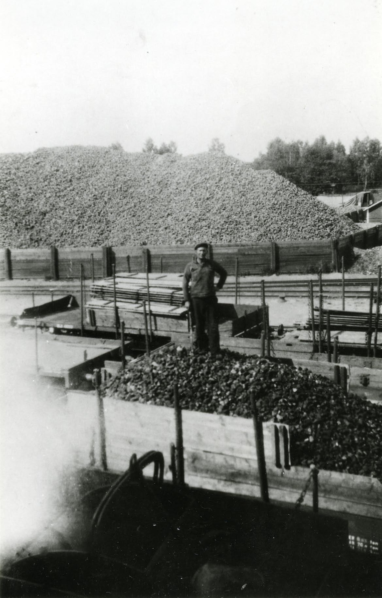Kolvagnar och upplag vid Fredriksskans 1937. En tubb ligger framför vagnen. August Lindström står på vagnen.
