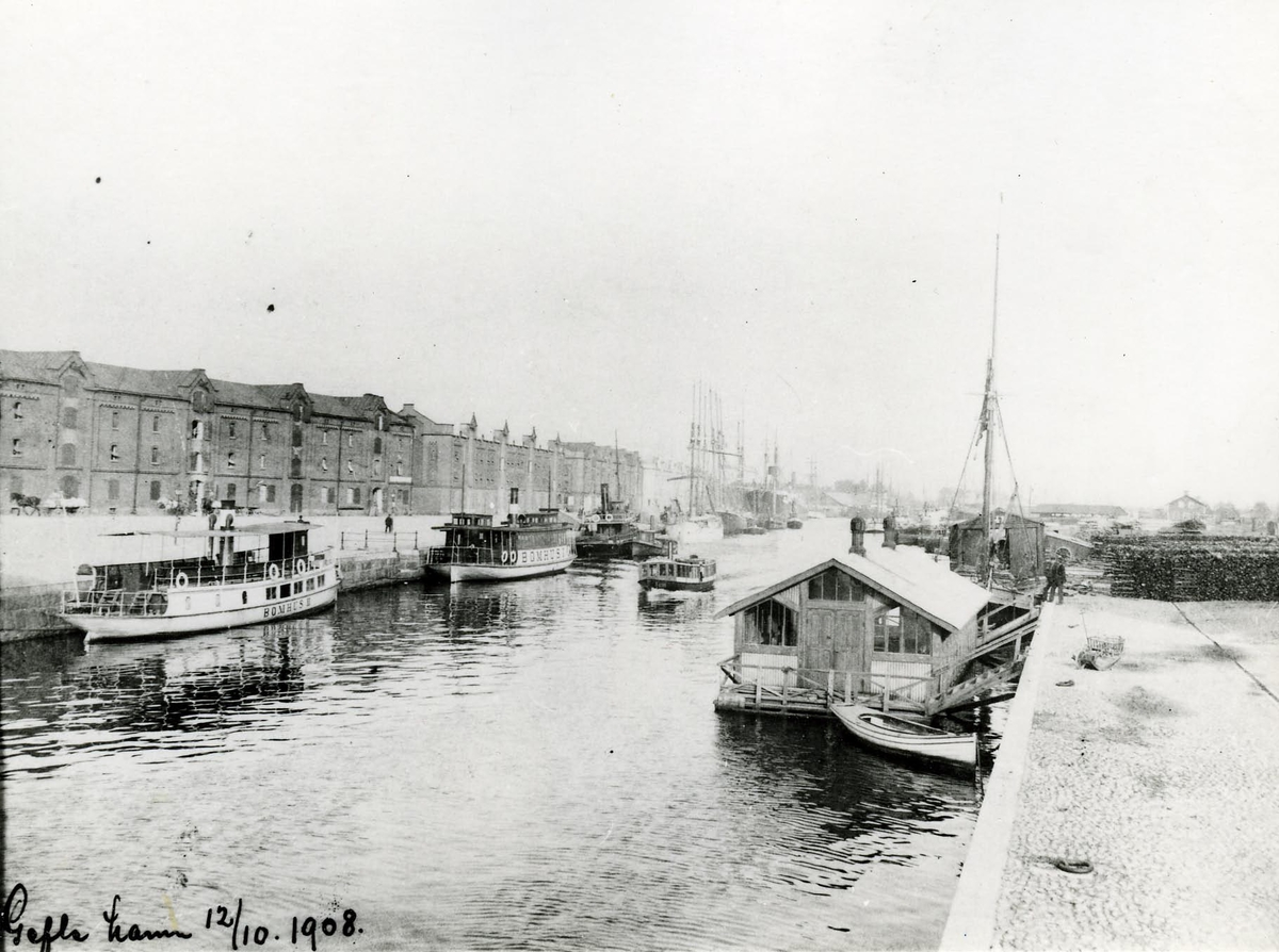 Gävle - inre hamnen. Till vänster Bomhus II och Bomhus I, till höger ett klapphus.