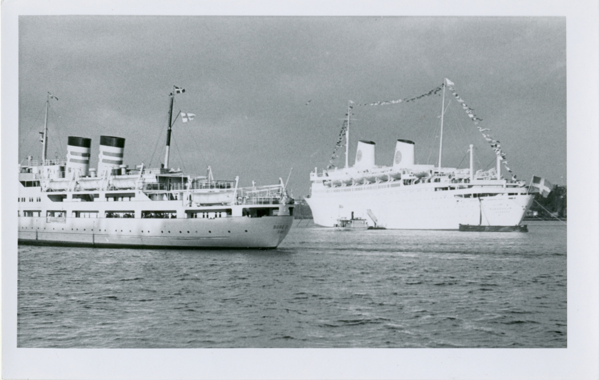 Foto i svartvitt visande visande passagerarfartygen BORE III och KUNGSHOLM på Stockholms Ström 1953.