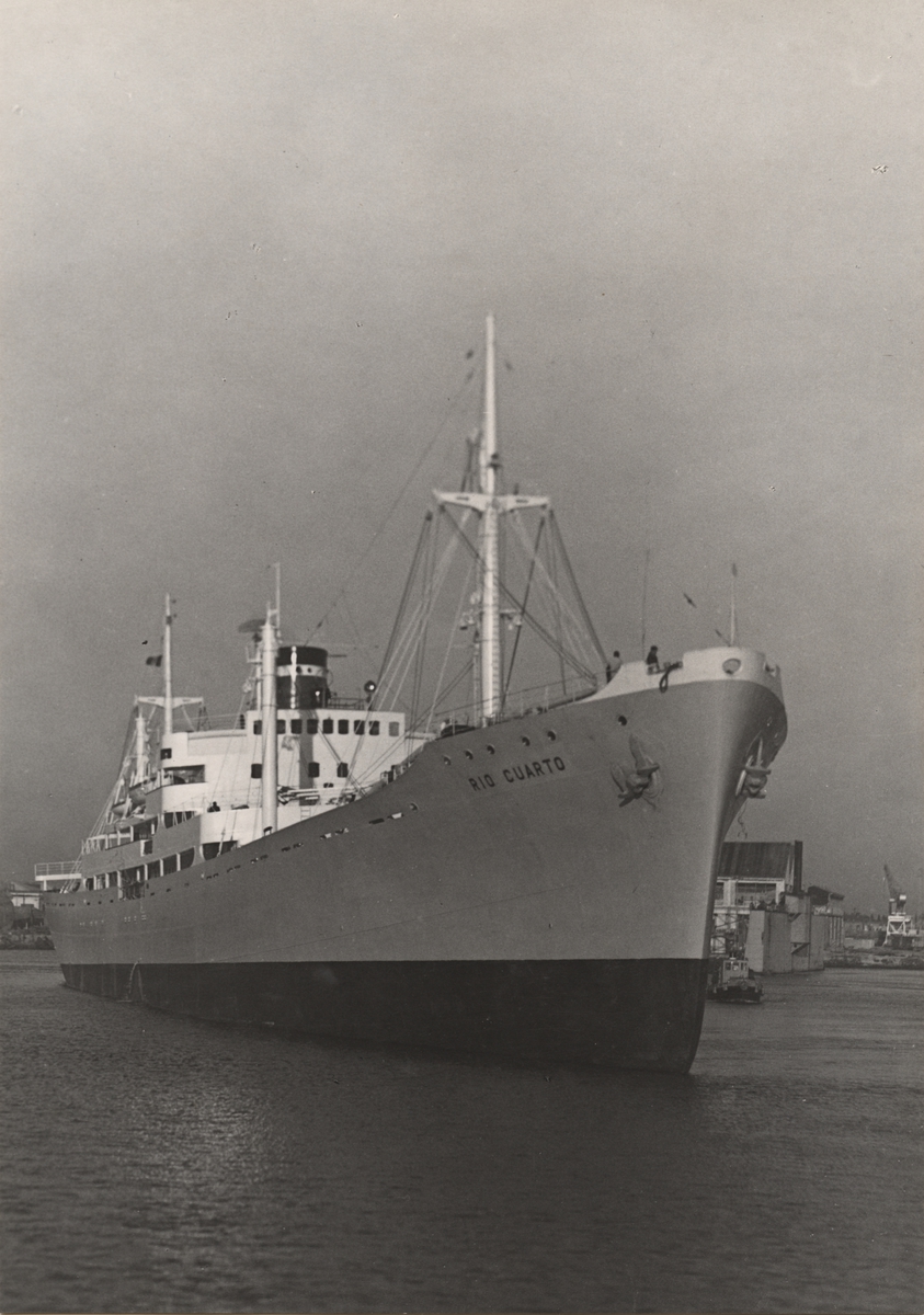 Foto från 1950 visande lastmotorfartyget "RIO CUARTO" av Buenos Aires. Fotot troligen taget vid varvet C.R.D.Adriatico, Monfalcone, den 23.1.1950.