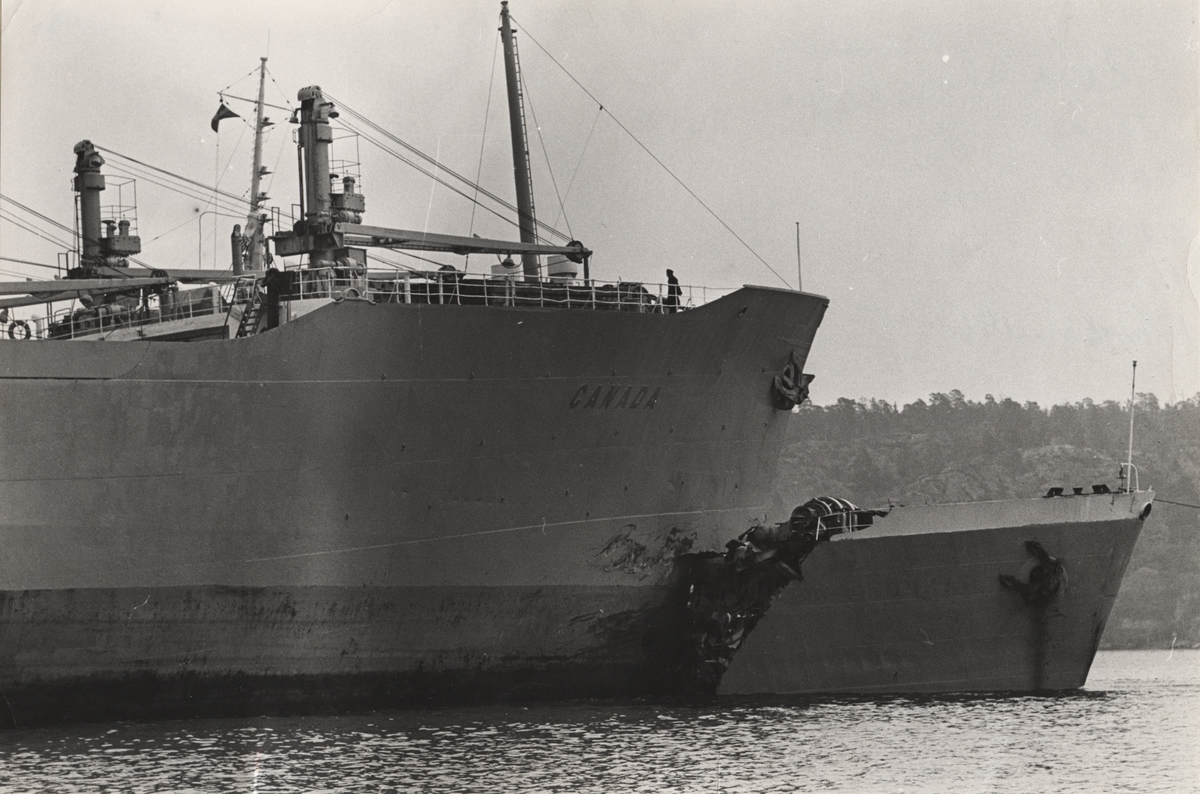 Kollision mellan det svenska lastmotorfartyget CANADA av Stockholm och den ryska tankern RAVA RUSSKAYA vid inloppet till Stockholms hamn den 24 okt. 1967.