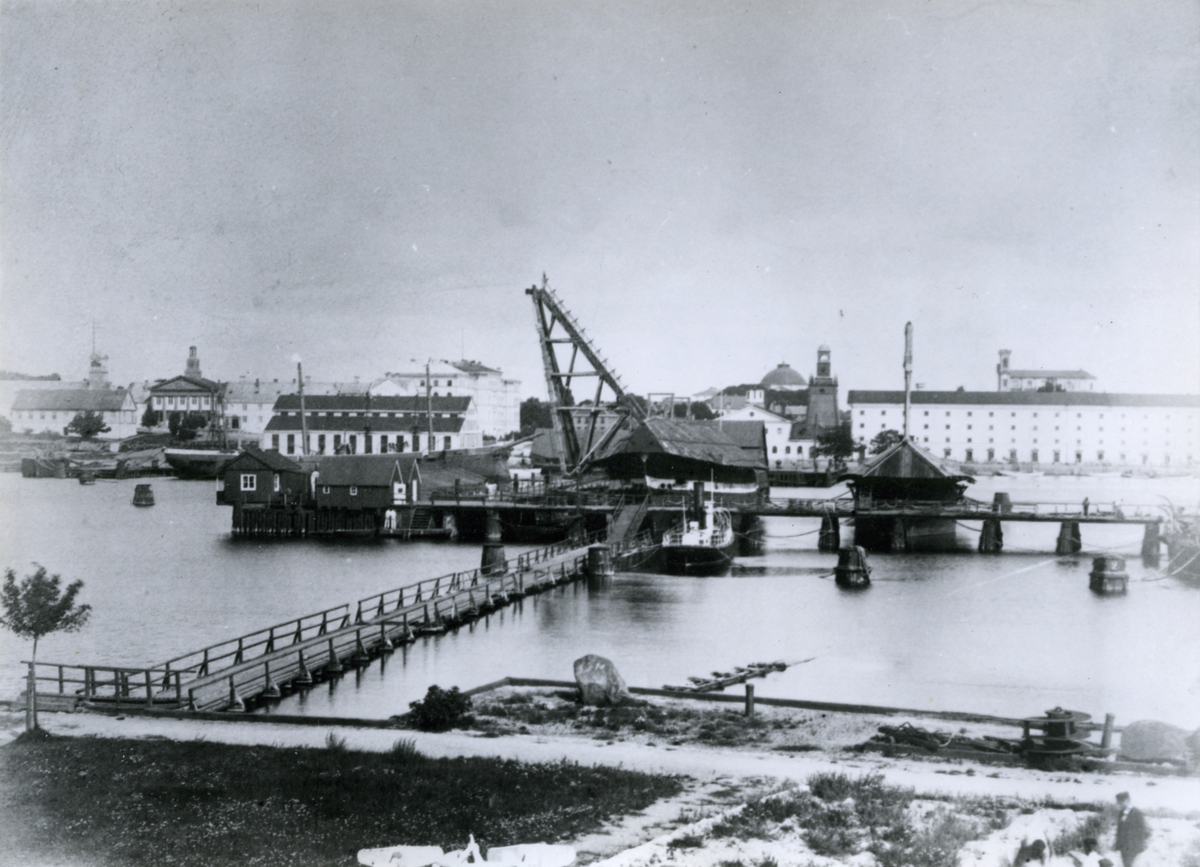 I bakgrunden under mastkranen ligger den avrustade ångkorvetten SAGA.