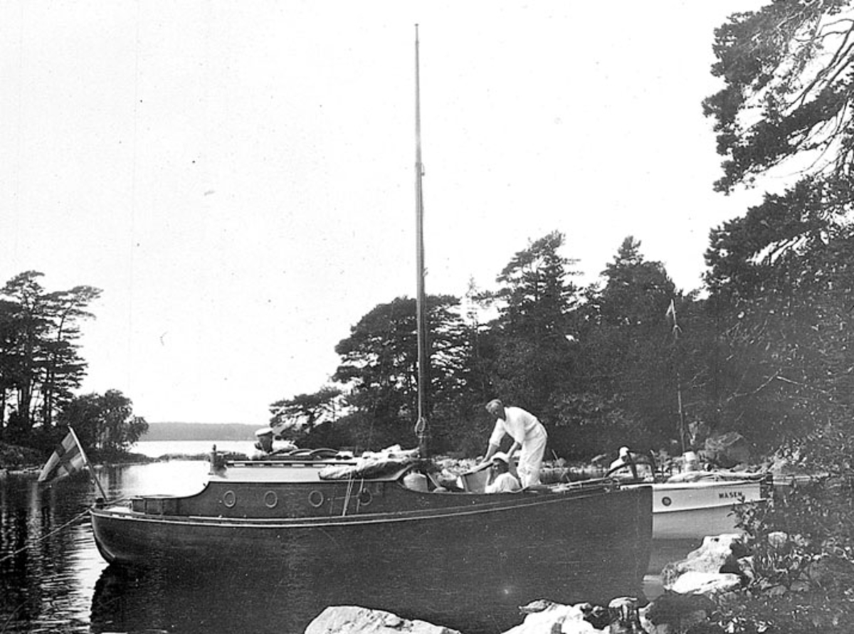 Motorbåtar i naturhamn. Koster förtöjd i land.
